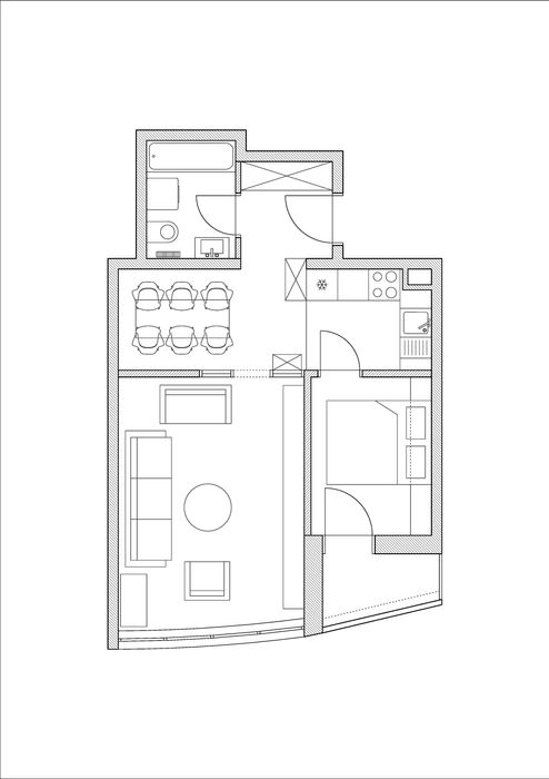 Uklanjanjem pregradnog zida i izmještanjem kuhinje omogućen je veći otvoreni prostor s povezanom kuhinjom, blagovaonicom i dnevnim boravkom. Za osiguranje dovoljno spremišnog prostora projektiran je jedan "L" element koji se proteže duž zida i sadrži kuhinju, ormare, nišu za TV i radni kutak.